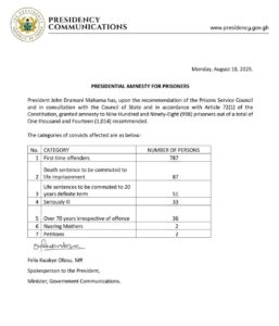President John Dramani Mahama has granted amnesty to 998 inmates across Ghana as part of measures to decongest the country’s prisons.